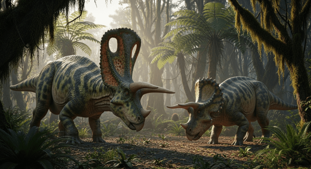 プロトケラトプスのように原始的な特徴を持つものから、トリケラトプスやペンタケラトプスのように、より大きく複雑な角やフリルを発達させたものまで、多様な姿が存在します。