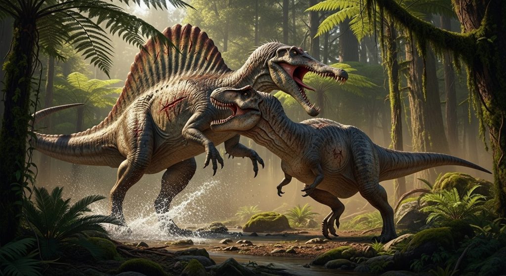 映画「ジュラシック・パーク3」におけるスピノサウルスとティラノサウルスの対決は、多くの観客にとって衝撃的なものでした。
